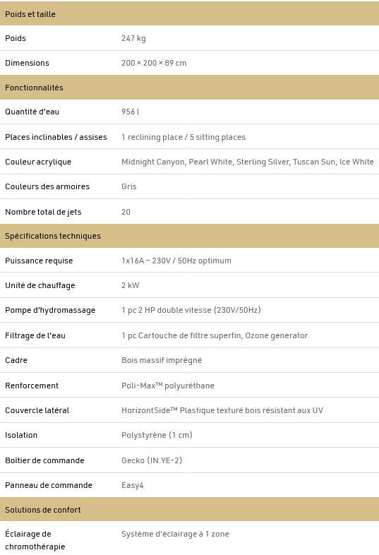 Notre spa Wellis Callisto est un excellent choix pour les utilisateurs qui ne veulent pas faire de compromis sur le nombre de places assises et allongées. Dans notre produit à succès, un groupe allant jusqu’à 5 personnes peut facilement se détendre tout en profitant de l’excellente expérience de bien-être offerte par 20 jets de massage. L’éclairage central à LED, les 4 couleurs différentes de l’intérieur de la piscine de massage sont disponibles pour un look impressionnant qui s’adapte le mieux à votre environnement domestique ! Notre piscine Callisto est équipée d’un générateur d’ozone, garantissant une qualité d’eau cristalline !