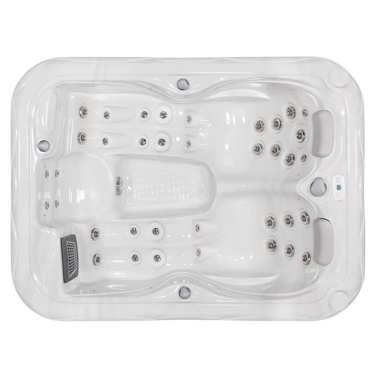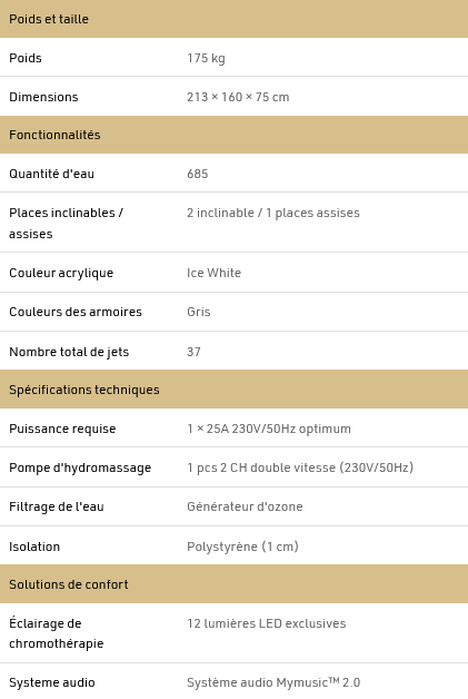 La disposition des deux fauteuils inclinables adjacents et d’un siège dans le spa Mars est unique sur le marché européen. En concevant le fauteuil inclinable MySeat™, nos concepteurs ont éliminé les inconvénients causés par toute différence de taille corporelle, afin que nos clients petits et grands puissent profiter de la même expérience de massage. Grâce à sa hauteur de 76 cm, ce modèle passe facilement par une porte d’entrée normale, ce qui le rend très facile à installer. Il est suffisamment spacieux pour inclure 37 jets, et suffisamment petit pour s’adapter presque n’importe où, que ce soit une terrasse ombragée ou une salle de bain légèrement plus grande.
